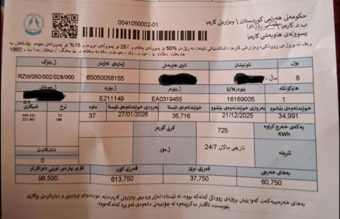 هاووڵاتییەک پسوڵەی کارەباکەی بڵاوکردووەتەوە و دەڵێت: 6 مانگە ماڵ چۆڵە و كارەبا لە سەعاتەكەوە كوژاوەتەوە، 98 هەزار لە مانگێدا، ئەم میللەتە چ تاوانێكی كردووە بەمجۆرە تۆڵەی لێئەكەنەوە.