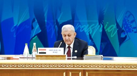 دوای ئەوەی سەرۆک کۆماری عێراق گەیشتە عشقئابادی تورکمانستان بۆ بەشداریی لە کۆڕبەندی ساڵ بۆ ئاشتی و متمانە، وتارێکی پێشکەشکردو داوای لەکۆمەڵگەی نێودەوڵەتی کرد کۆتایی بەجەنگ بهێن.