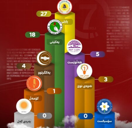 دوای ڕاگەیاندنی ئەنجامی هەڵبژاردنی ئەنجومەنی نوێنەران، دەنگی حزبە کوردستانییەکان ئاشکرابوون، دوو حزبە دەسەڵاتدارەکەی هەرێمیش، پارتی دیموکراتی کوردستان 27 کورسی، یەکێتیی نیشتمانی کوردستانیش 18 کورسی بوون.
