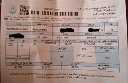 17 شوبات هاوڵاتیەک: ماڵمان چۆڵ بووە وپارەی کارەبامان بۆهاتۆتەوە هاووڵاتییەک پسوڵەی کارەباکەی بڵاوکردووەتەوە و دەڵێت: 6 مانگە ماڵ چۆڵە و كارەبا لە سەعاتەكەوە كوژاوەتەوە، 98 هەزار لە مانگێدا، ئەم میللەتە چ تاوانێكی كردووە بەمجۆرە تۆڵەی لێئەكەنەوە.